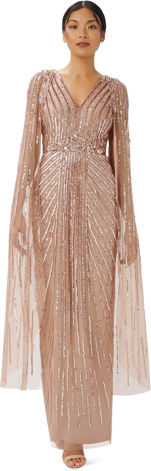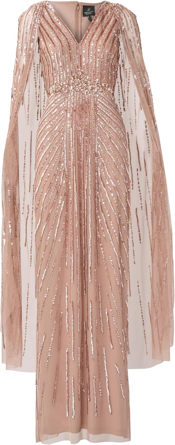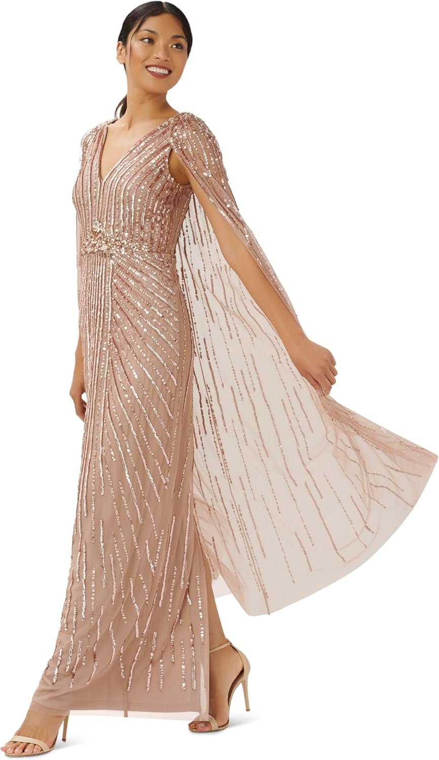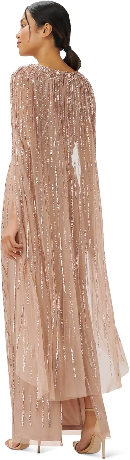 Pure glamour. Our floor-sweeping sleeveless gown takes on a fresh new mood with its dazzling display of handsewn beadwork over a soft mesh overlay and the dramatic cape that adds the perfect finishing touch. The streamlined silhouette is detailed with a flattering v-neckline and a sleek back zip closure.
