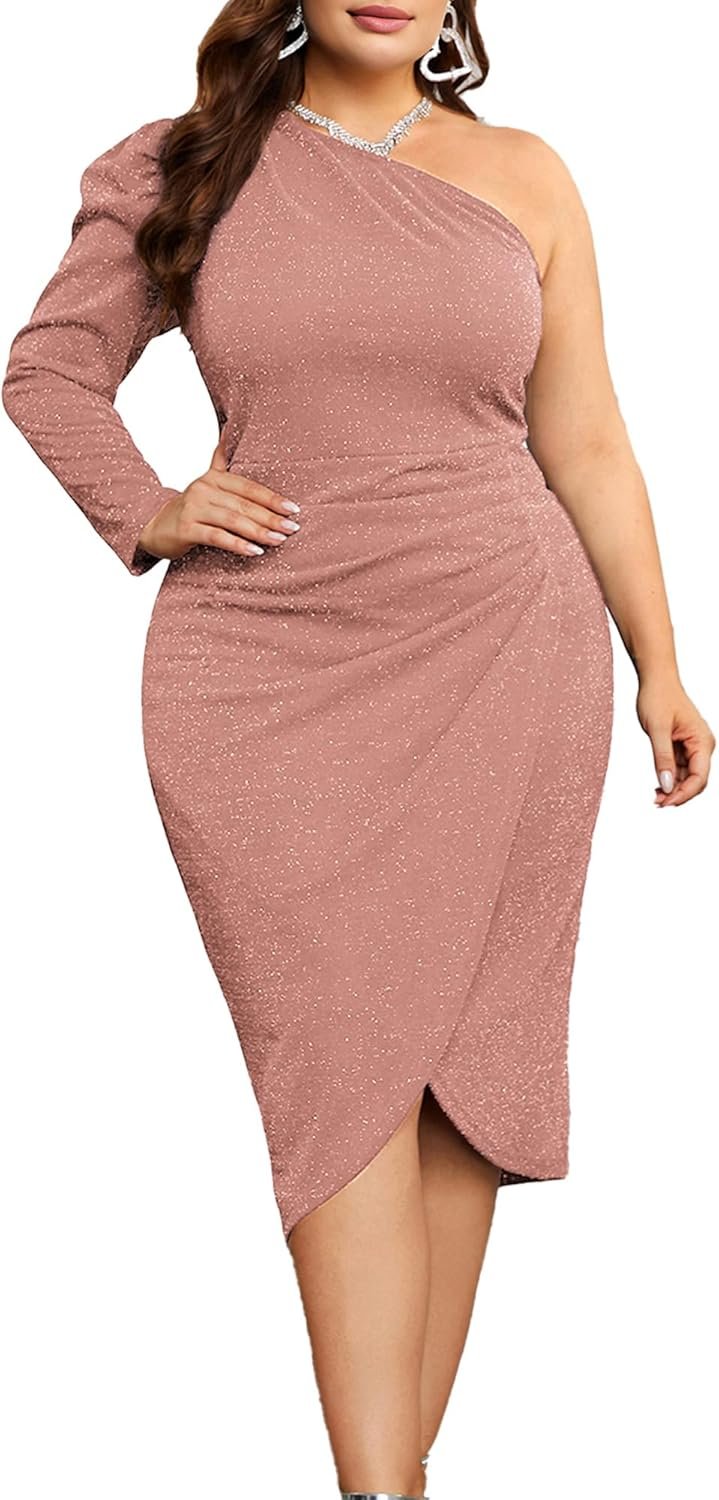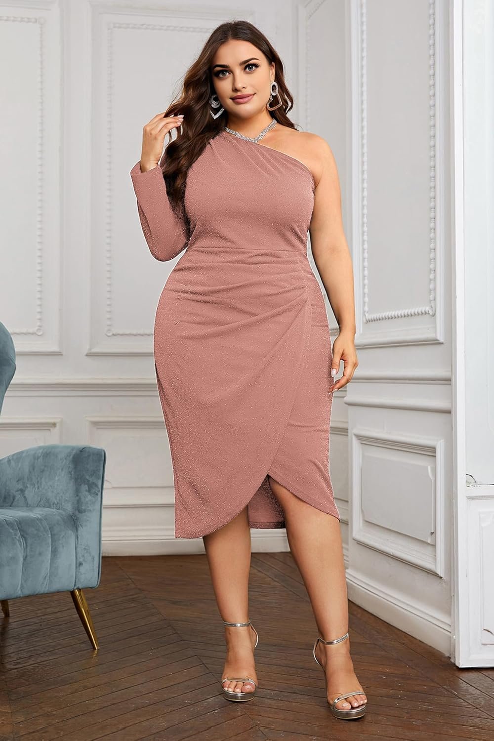 This long sleeve one shoulder dress is designed specifically for plus size women, providing a flattering and fashionable fit for any body shape.