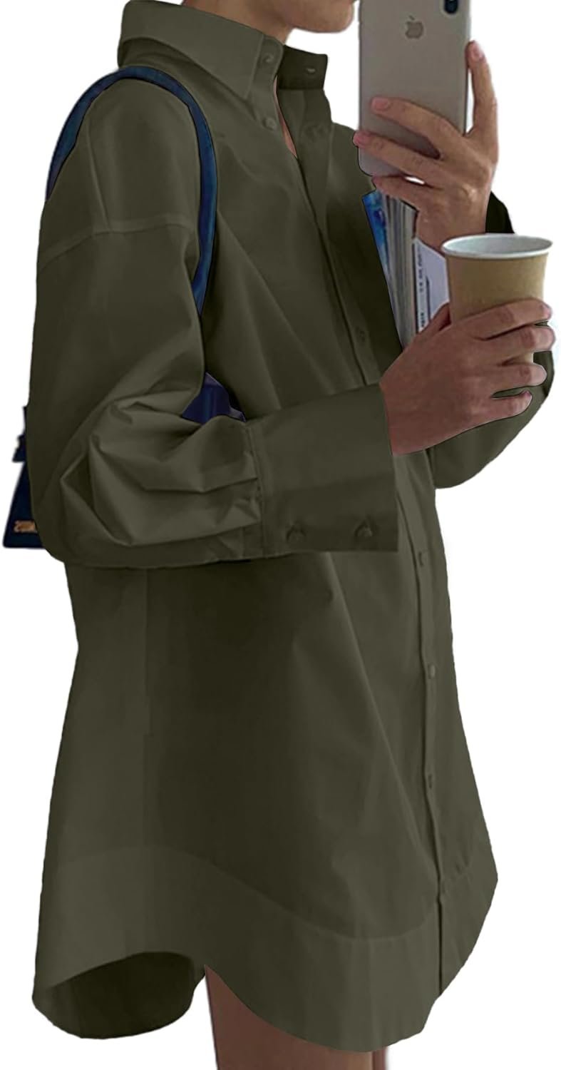 LYANER Women’s Casual Shirt Dress Collar V Neck Button Down Loose Long Sleeve Mini Dresses