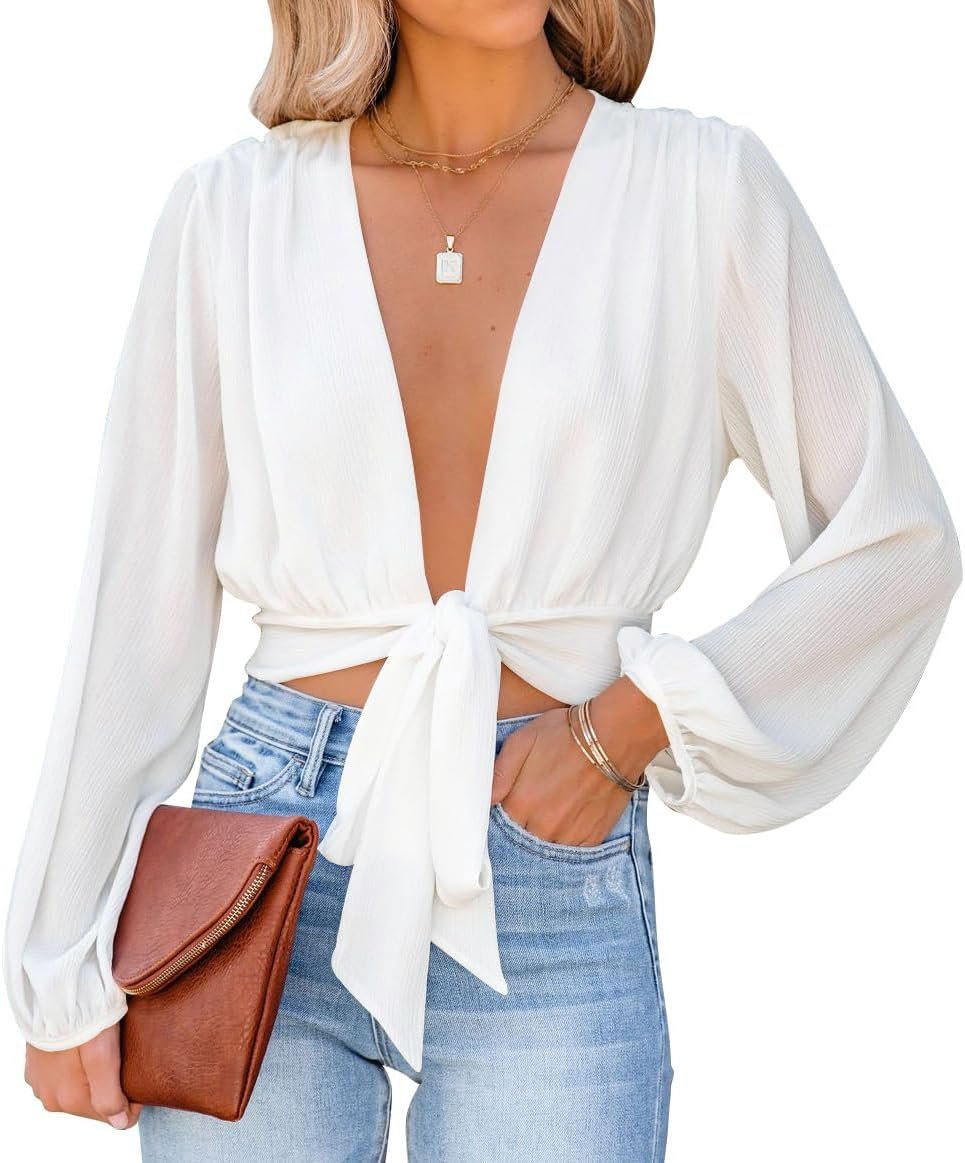 LYANER Women’s Deep V Neck Tie Front Knot Sexy Wrap Crop Top