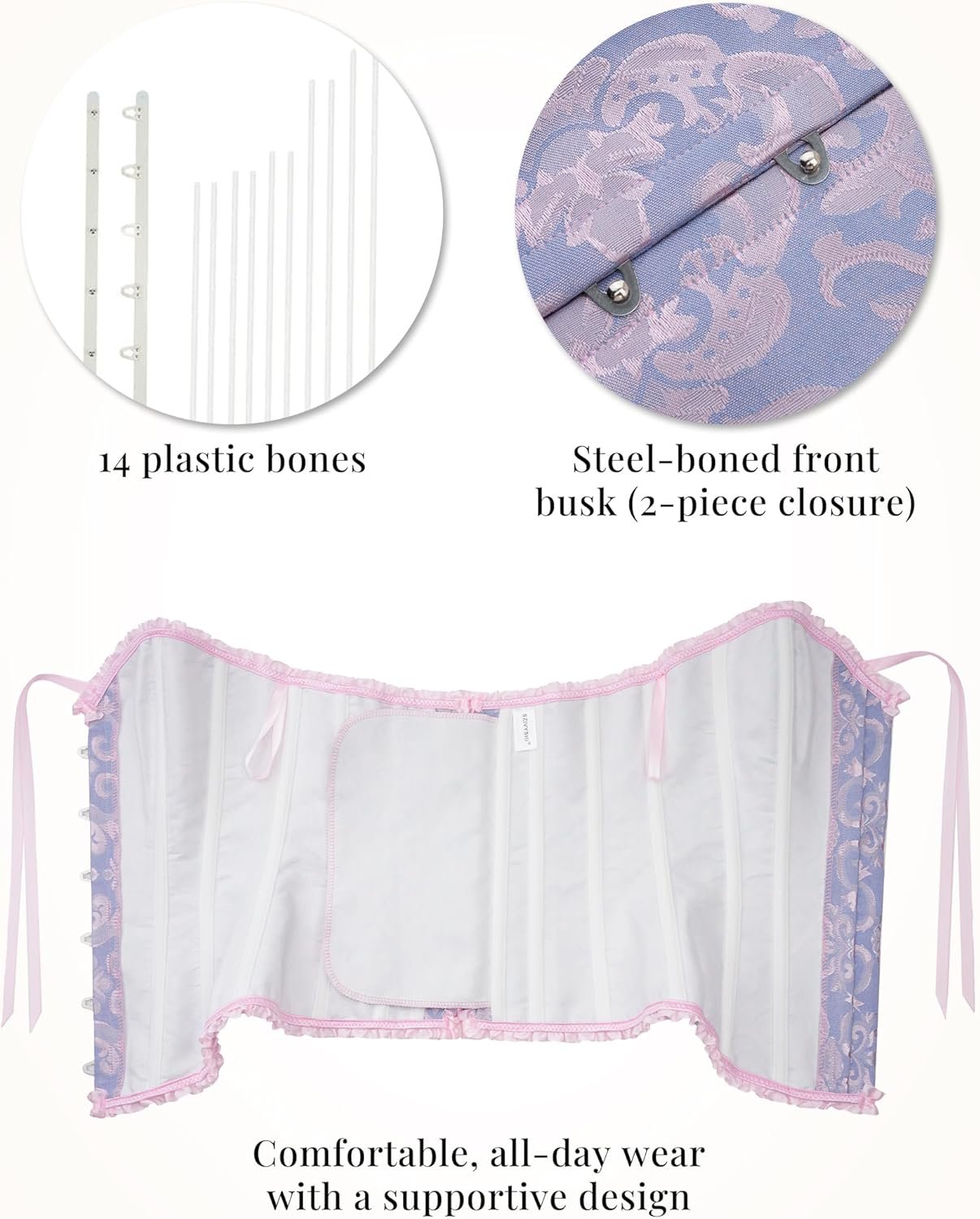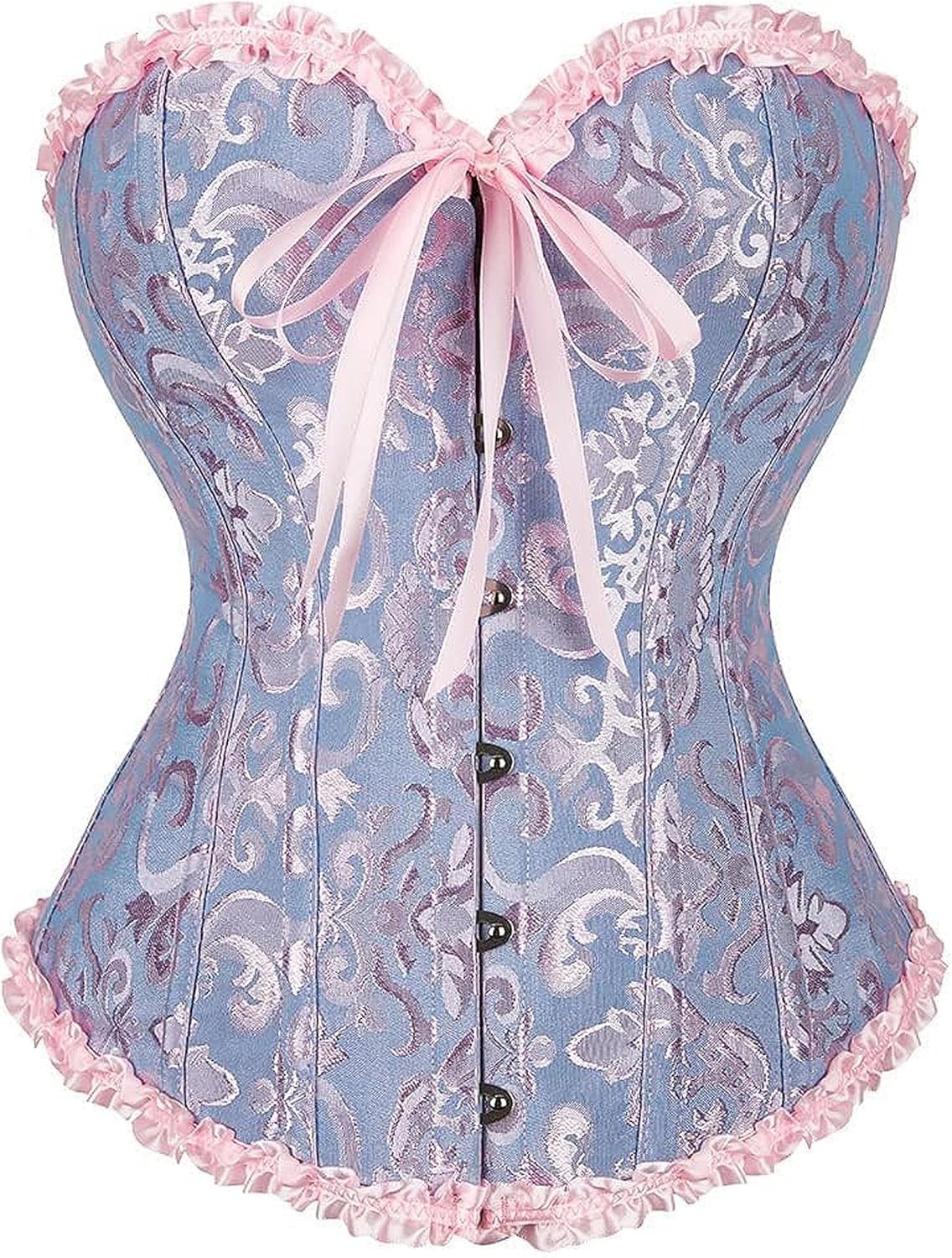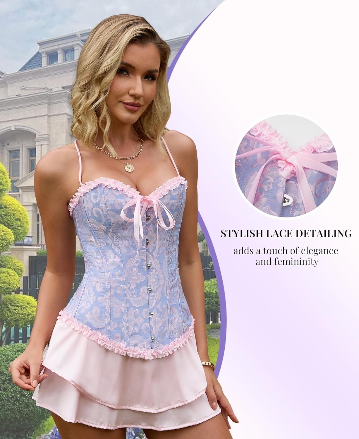 The video showcases the product in use.The video guides you through product setup.The video compares multiple products.The video shows the product being unpacked. Blue and pink corset tops for women Merchant Video