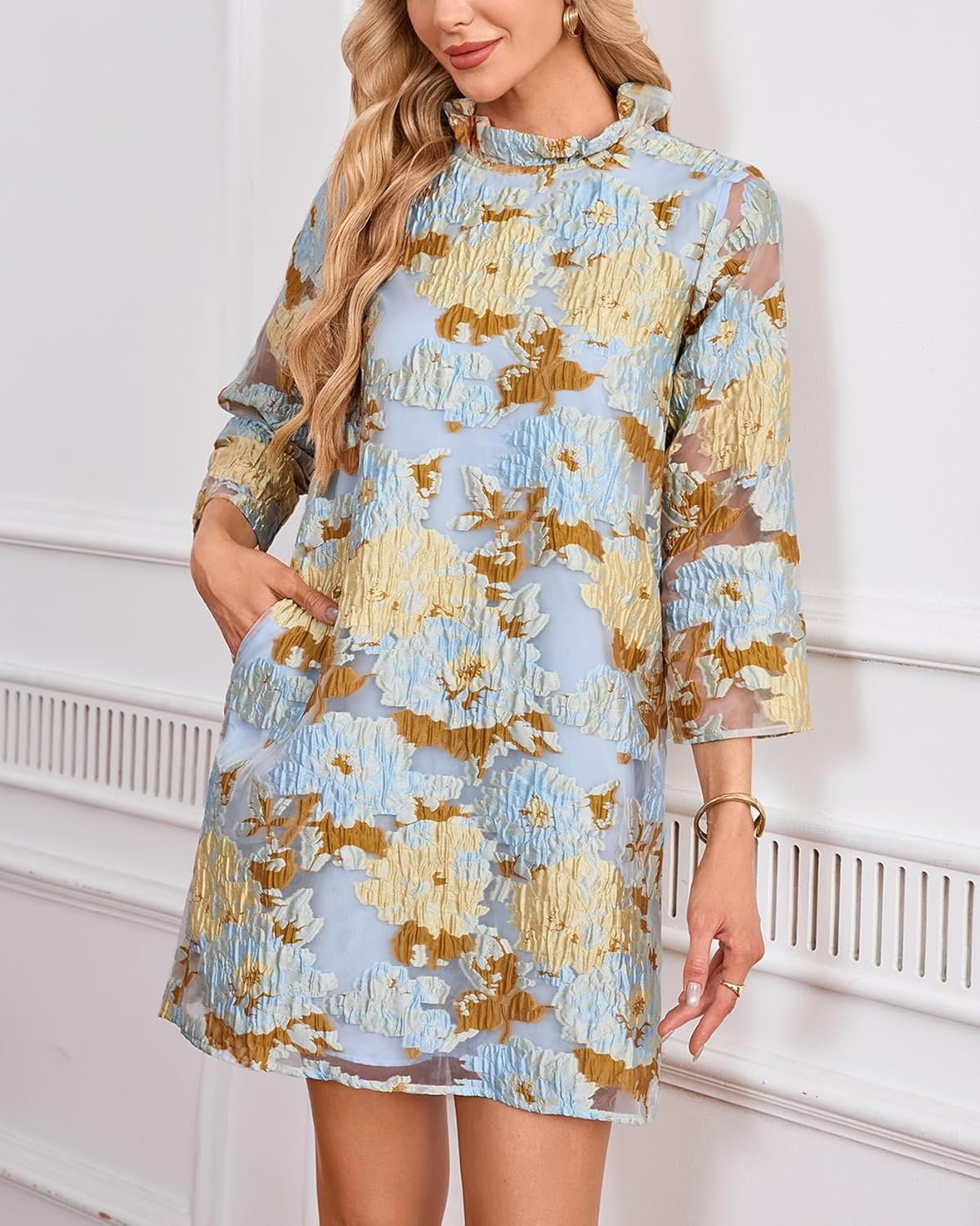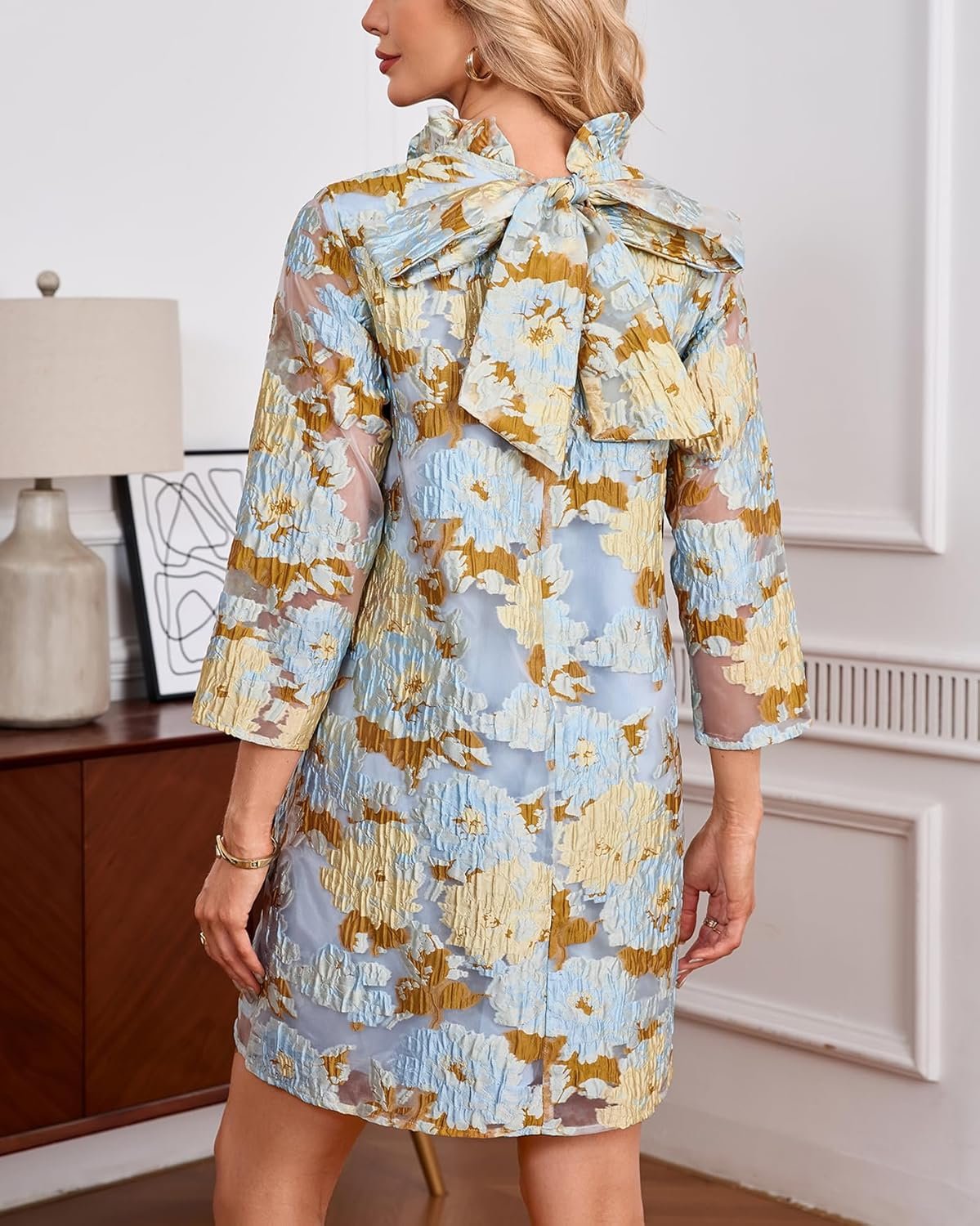 Yexpine Long Sleeve Floral Jacquard Elegant Party Dress for Women