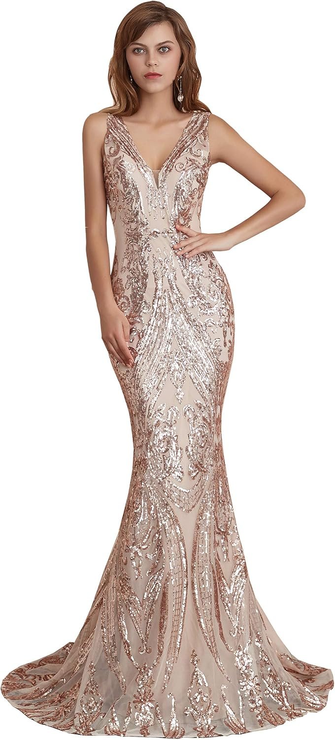 Women’s V-Neck Sequins Sleeveless Lace-up Mermaid Evening Dress